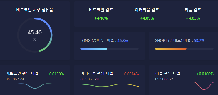 비트코인과 이더리움 그리고 리플의 펀딩 비율을 실시간으로 확인 할 수 있으며, 선물거래 롱/숏 비율과 도미넌스를 일괄적으로 살펴볼 수 있습니다.