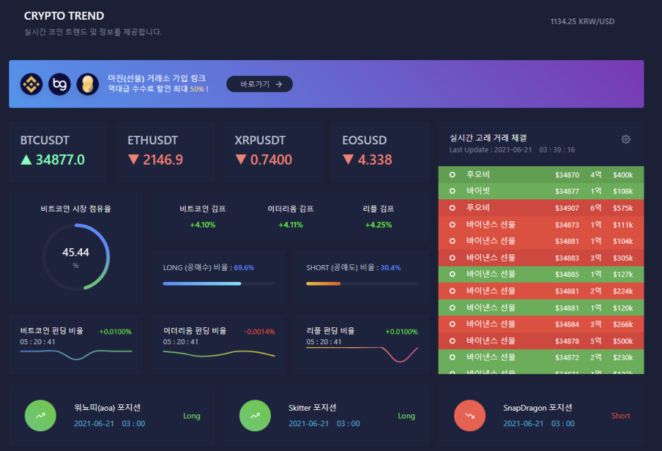 선물 거래를 이용하면서 최근 제가 부쩍 많이 참고하고 있는 사이트 중 하납니다. 시그비트는 개인의 홍보를 목적으로 개설된 웹사이트이지만, 크립토 트렌드를 한눈에 확인 할 수 있는 연동 기능을 무료로 제공해주고 있어 참고하기가 좋습니다.