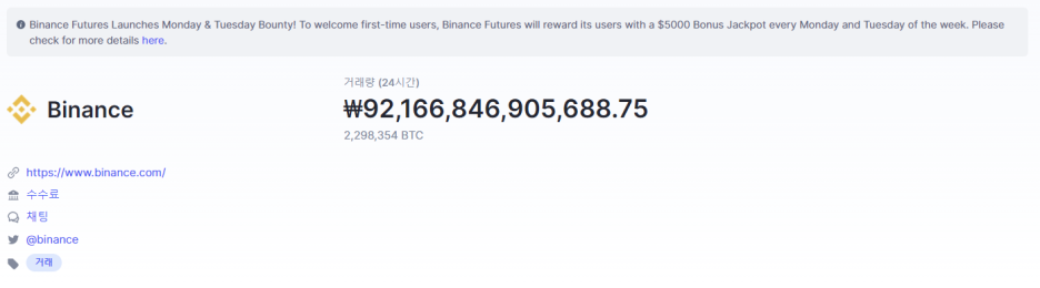 참고로 하루 바이낸스에서 거래되는 금액만 무려 92조원에 달합니다. 비트코인 229개에 해당하는 압도적인 거래량을 보여주고 있습니다.