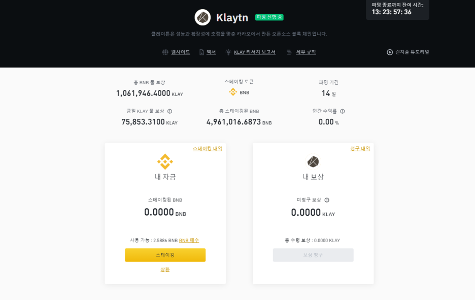 300달러 정도에 BNB를 현물로 매수한 뒤 이번 클레이 런치풀에 참여해봤습니다. 샘플이기 때문에 소액만 매수한 점 양해 부탁드립니다.