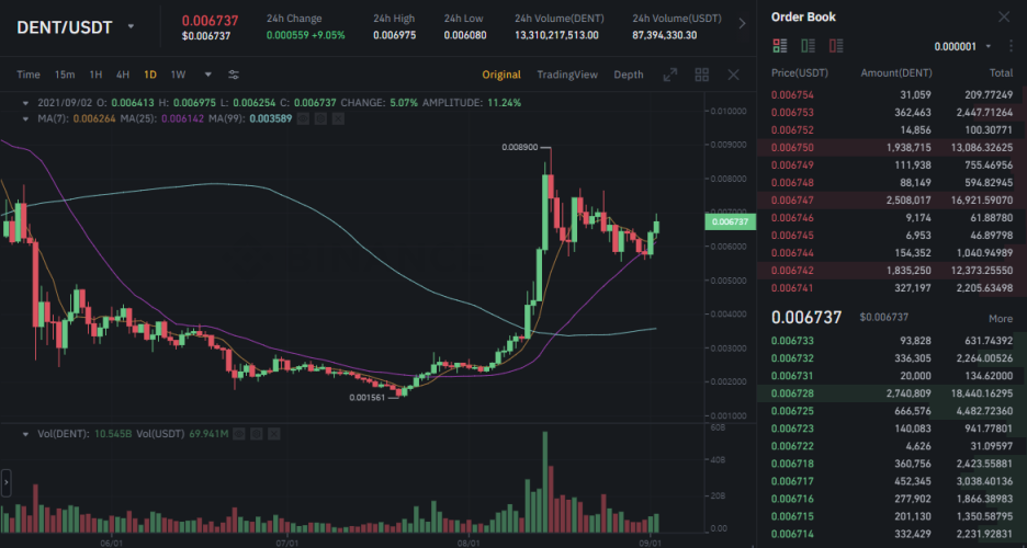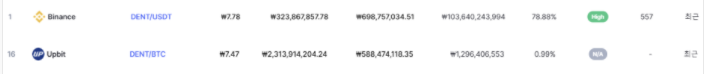 덴트 거래량 비교. 바이낸스 70% 이상. 업비트 1% 미만