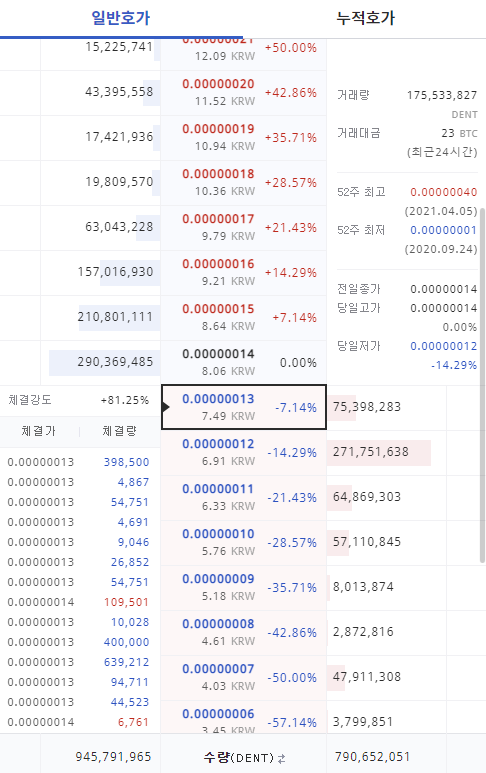 1000만원어치 덴트를 업비트 BTC 마켓에서 구매하시면, 시장가로 긁어야 하며 구매하자마자 -7%가 될 확률이 높습니다.