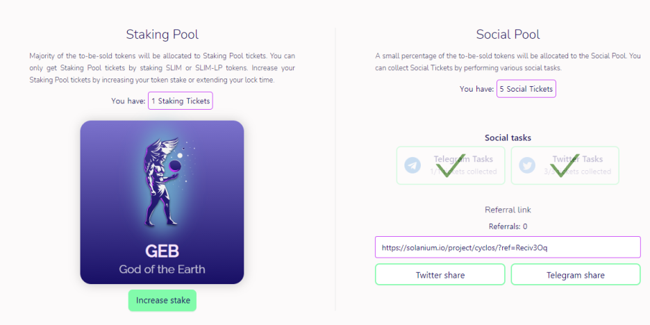 이번 사이클로스(Cyclos) IDO는 스테이킹풀 / 소셜풀 2가지로 참여 가능했다.