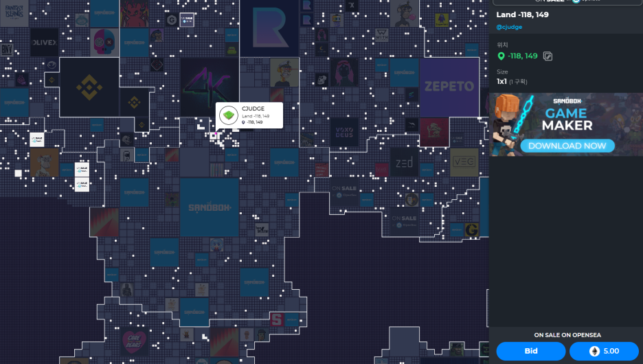 좌측에 위치한 앱을 눌러주면 샌드박스 랜드를 확인 할 수 있는 지도가 나온다.