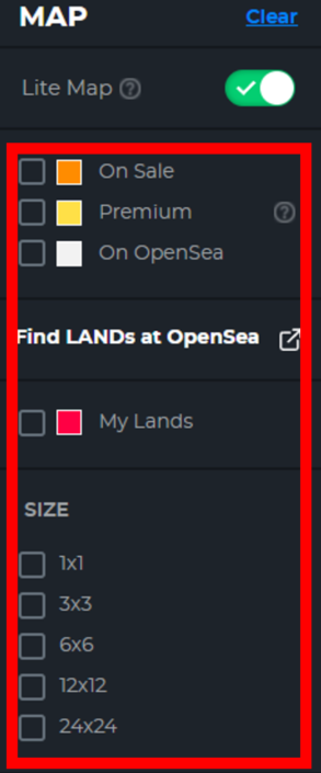 On Sale - 현재 옥션(경매) 진행중인 랜드 Premium - 프리세일 때 장식품과 함께 판매된 랜드 On OpenSea - 오픈씨에 등록된 랜드 My Lands - 현재 내가 보유한 랜드 |