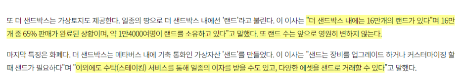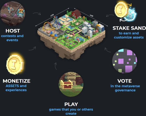 랜드 위에 건설된 건축물과 게임메이커(코딩이 필요 없는 게임 제작 도구)를 활용해 만들어진 게임을 샌드박스 유저들이 플레이를 하게 되며, 게임에 참여한 인원들이 수익활동을 이어나갈 수 있는 시스템을 개발중인 상황이라는 것이죠.