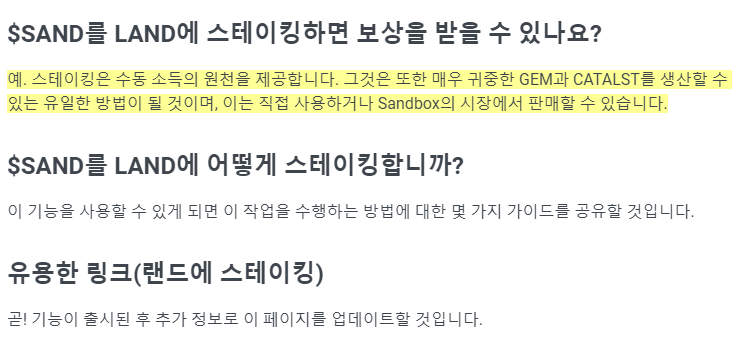 두번째로, 임대를 해줄 계획이 없다면 언제든지 사고 팔 수 있는 샌드를 구매해 랜드에 스테이킹을 하여 수익을 창출하는 방법도 이용해볼 수 있습니다. (TBS)
