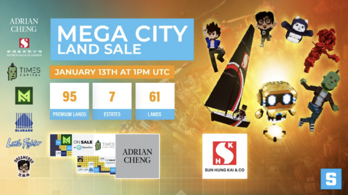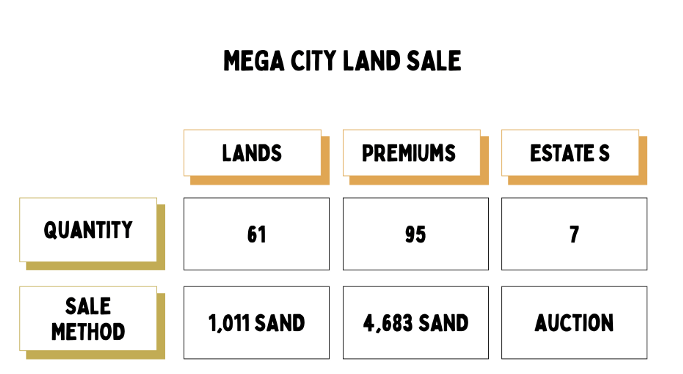 이번에 판매될 샌드박스 랜드세일 대상은 메가 시티(Mega City)라는 새로운 공간을 구축할 예정이라고 합니다. 인접한 IP로는 ADRIAN CHENG, SUN HUNG KAI&CO, 오픈씨, TIMES CAPITAL 등 굵직굵직한 녀석들이 있네요.
