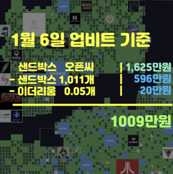 필요한 샌드박스 1011개와 소량의 이더리움(수수료)를 제하면 즉시 수익금으로는 천만원정도를 획득하실 수 있어요. 대략 40%정도의 수익이죠.
