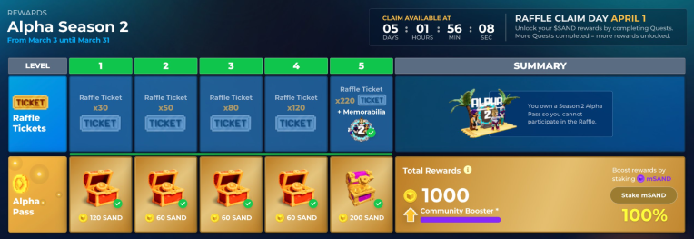 이전 시즌과 마찬가지로 플레이를 통해 최대 레벨 5까지 보상 수령을 위해 해금한 뒤 알파패스를 보유하면 최대 500 샌드박스 코인을 보상으로 수령 할 수 있습니다.