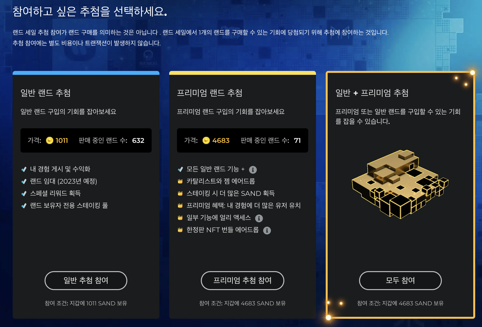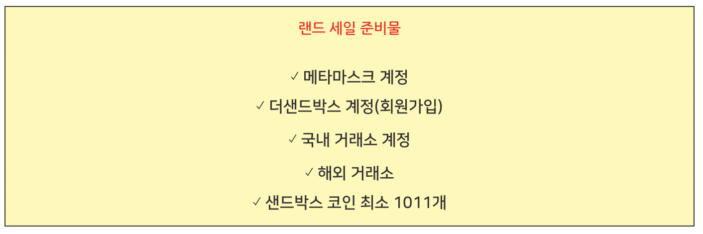 랜드 세일은 KYC가 완료된 계정 1개당 1회에 한해 참여 가능하기 때문에 본인이 일반 랜드 세일만 참여할 것인지 혹은 일반랜드+프리미엄 랜드 두개를 동시에 참여할 것인지 신중한 결정 내리시기 바랍니다.