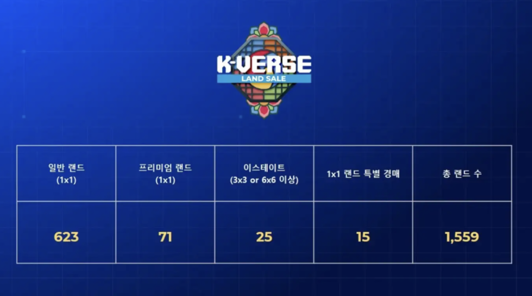 K-verse 랜드 세일은 일반 랜드/ 프리미엄 랜드 2가지 형태로 제공되는데요. 이번 랜드 세일에 준비된 수량은 일반 랜드 632개, 프리미엄 랜드 71개 총합 703개의 랜드가 마련되어 있습니다.