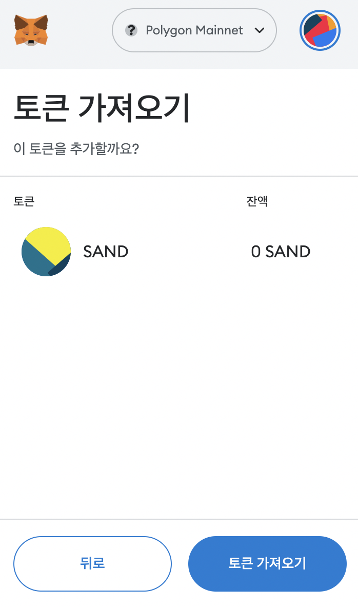 위와 같이 샌드박스 1011개, 매틱 소량이 메타마스크(폴리곤 메인넷)에 들어온 것이 확인되면 모든 준비는 끝입니다.