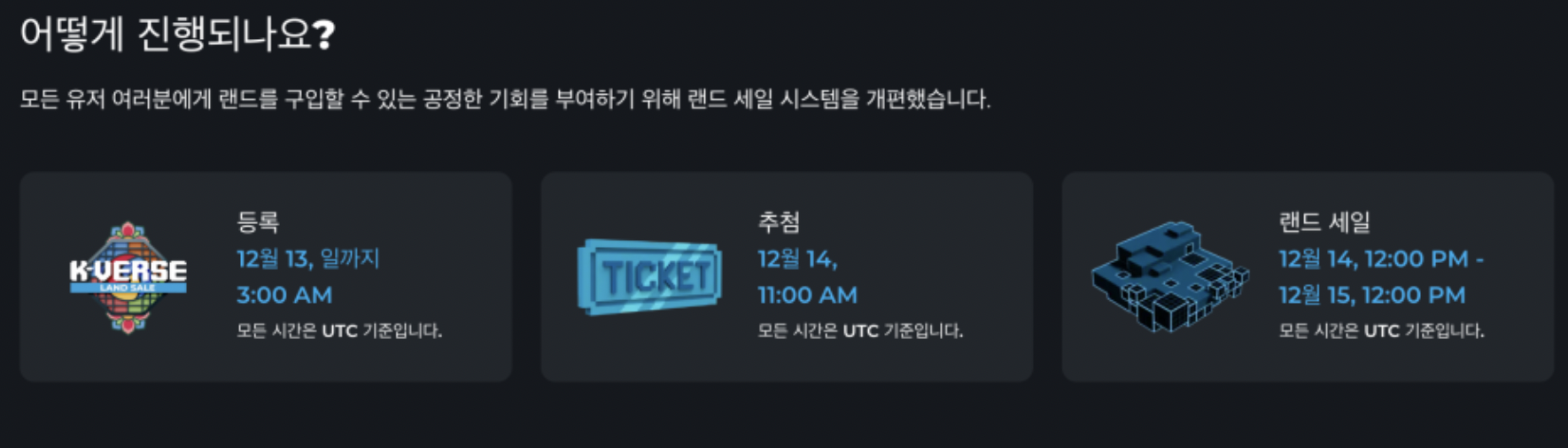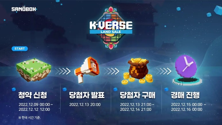 더 샌드박스 K-verse 랜드 세일은 12월 9일 0시부터 12월 13일 오후 12시까지 청약이 진행되며, 청약 당첨자는 12월 14일 오후 8시에 공개됩니다. 저도 이렇게 신청을 완료했는데 꼭 당첨이 됐으면 좋겠네요.