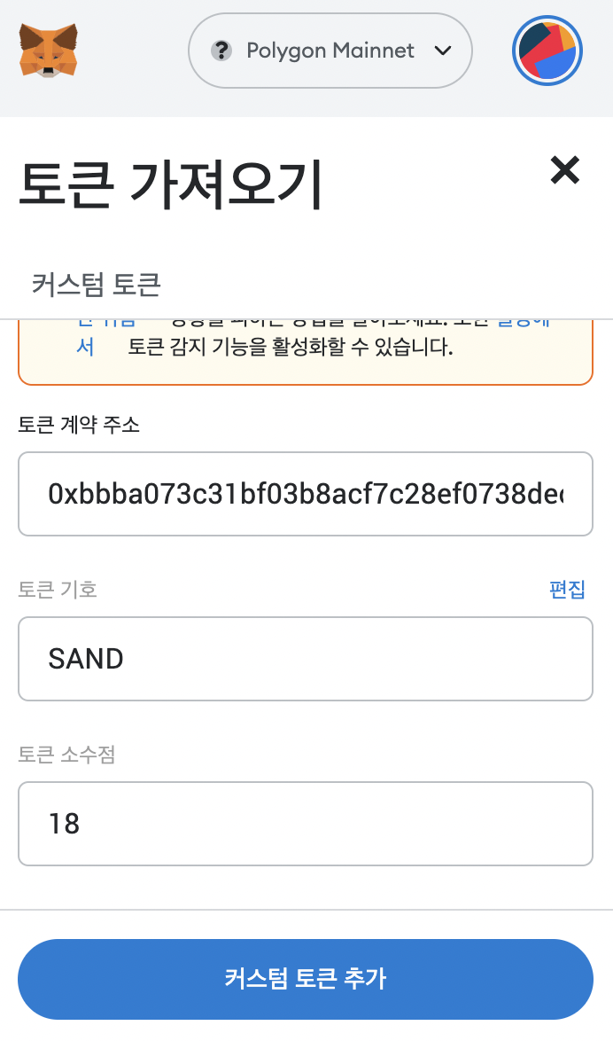 만약 전송 후 메타마스크 폴리곤 메인넷에 샌드박스 토큰이 보이지 않는다면, 계약 주소를 추가해주시면 됩니다. 메타마스크 월렛 하단에 토큰 추가로 mSAND 토큰 주소를 입력해주세요. 계약 주소를 입력하면 토큰 기호와 소수점 기타 정보들이 자동으로 입력되며, 커스텀 토큰 추가를 해주시면 됩니다.