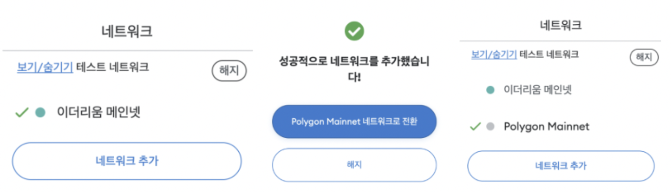 그런 다음 폴리곤 메인넷 네트워크가 추가되면 기존 이더리움 메인넷에서 폴리곤 메인넷 네트워크로 변경해주세요. 자 그럼 월렛 준비는 끝입니다.