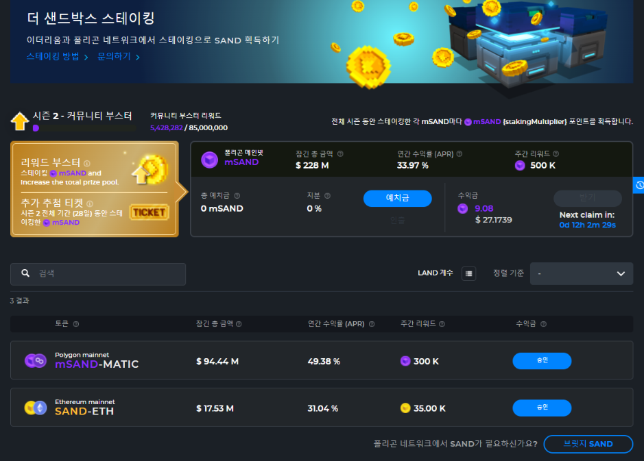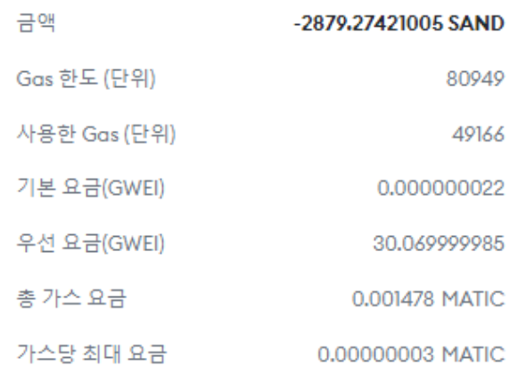 샌드박스 생태계에서는 코인을 스테이킹 하면, 이자로 SAND가 지급되기 때문에 당시 시세 1500만원 어치(현물) 샌드박스를 폴리곤 브릿지를 이용해 스왑했습니다. 스크린샷 그대로 ERC20 기반 샌드박스 코인 2879개가 폴리곤 기반의 샌드박스 코인으로 스왑되었고, 저렴한 수수료로 기분 좋게 스테이킹을 완료했습니다.
