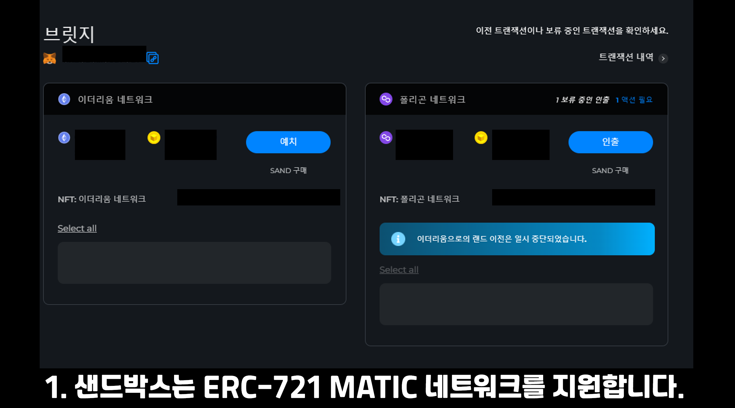 샌드박스는 이더리움과 폴리곤 네트워크 2가지를 모두 지원합니다. 동시에 더샌드박스 홈페이지에서 제공하는 브릿지는 (ERC->MATIC) (MATIC->ERC) 네트워크를 변환해주는 기능을 제공하고 있습니다.