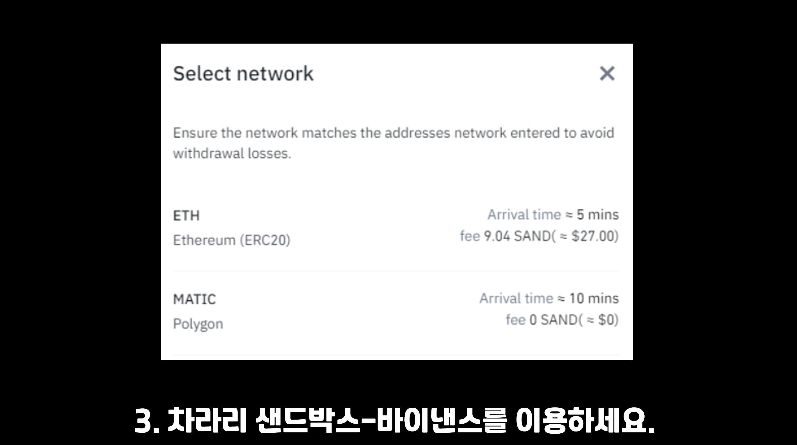 복잡하게 생각할 필요 없이 샌드박스 랜드나 스테이킹 서비스를 이용하는 경우라면 멀티체인을 지원하는 바이낸스를 이용하세요. 메타마스크-더샌드박스-바이낸스 같은 ERC-20, MATIC 네트워크를 자유롭게 사용할 수 있습니다.