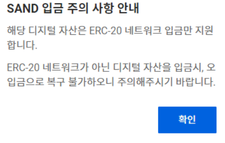 업비트는 여전히 멀티체인을 완벽하게 지원하고 있지 않습니다. 더군다나 샌드박스 코인은 여전히 ERC-20 네트워크를 이용하고 있어 샌드박스 생태계를 이용하다가 업비트에 입금&출금 시 각별히 주의하시기 바랍니다.