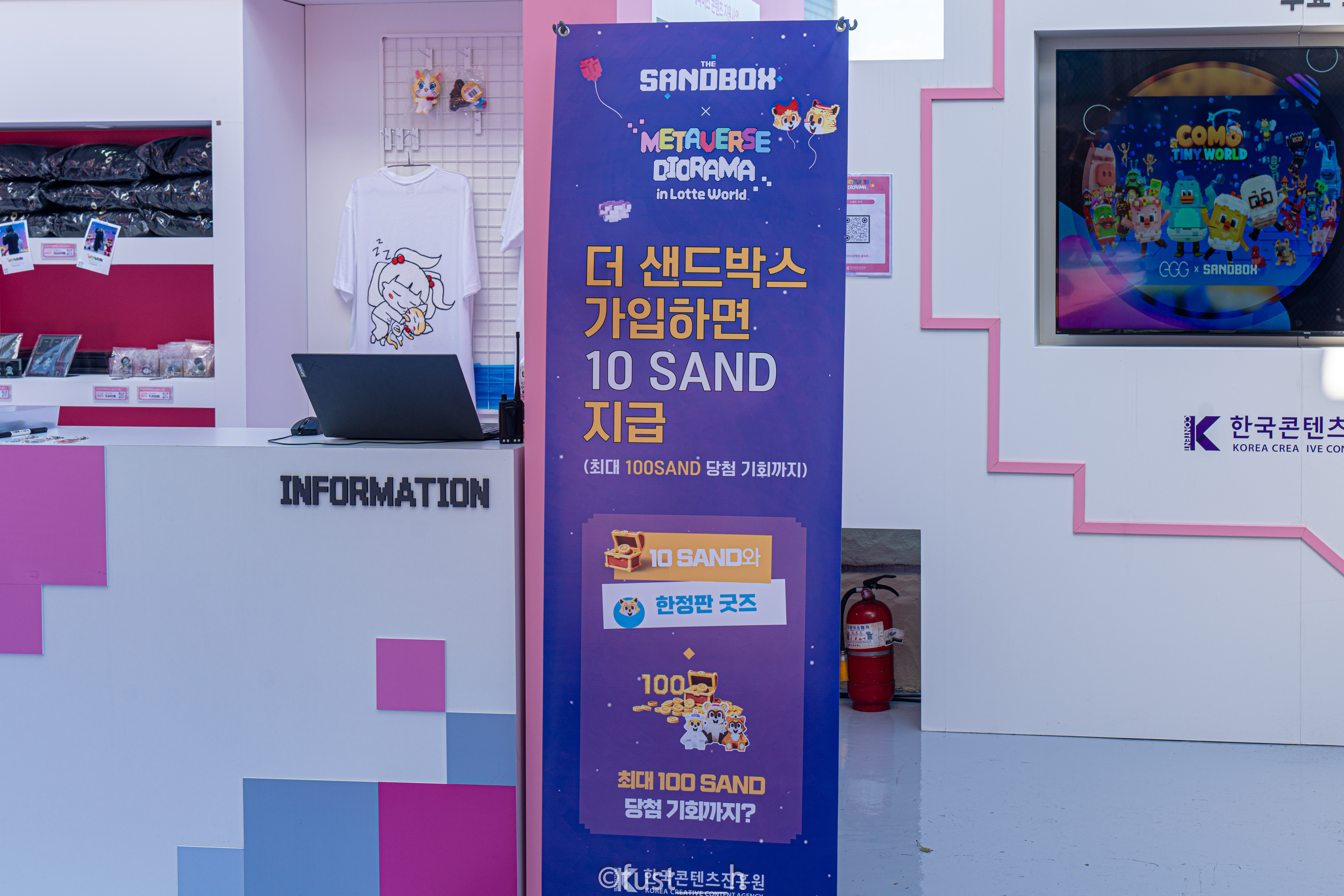들어서자마자 가장 먼저 체험해보셔야 할 것은 더샌드박스 가입 이벤트! 가입만 해도 10SAND 코인을 확정 지급을 해주고, 특별 제작된 더샌드박스.x 롯데월드 한정판 굿즈도 받으실 수 있어요. 이 날 운이 따른다면, 최대 100SAND 당첨의 기회도 주어진답니다.