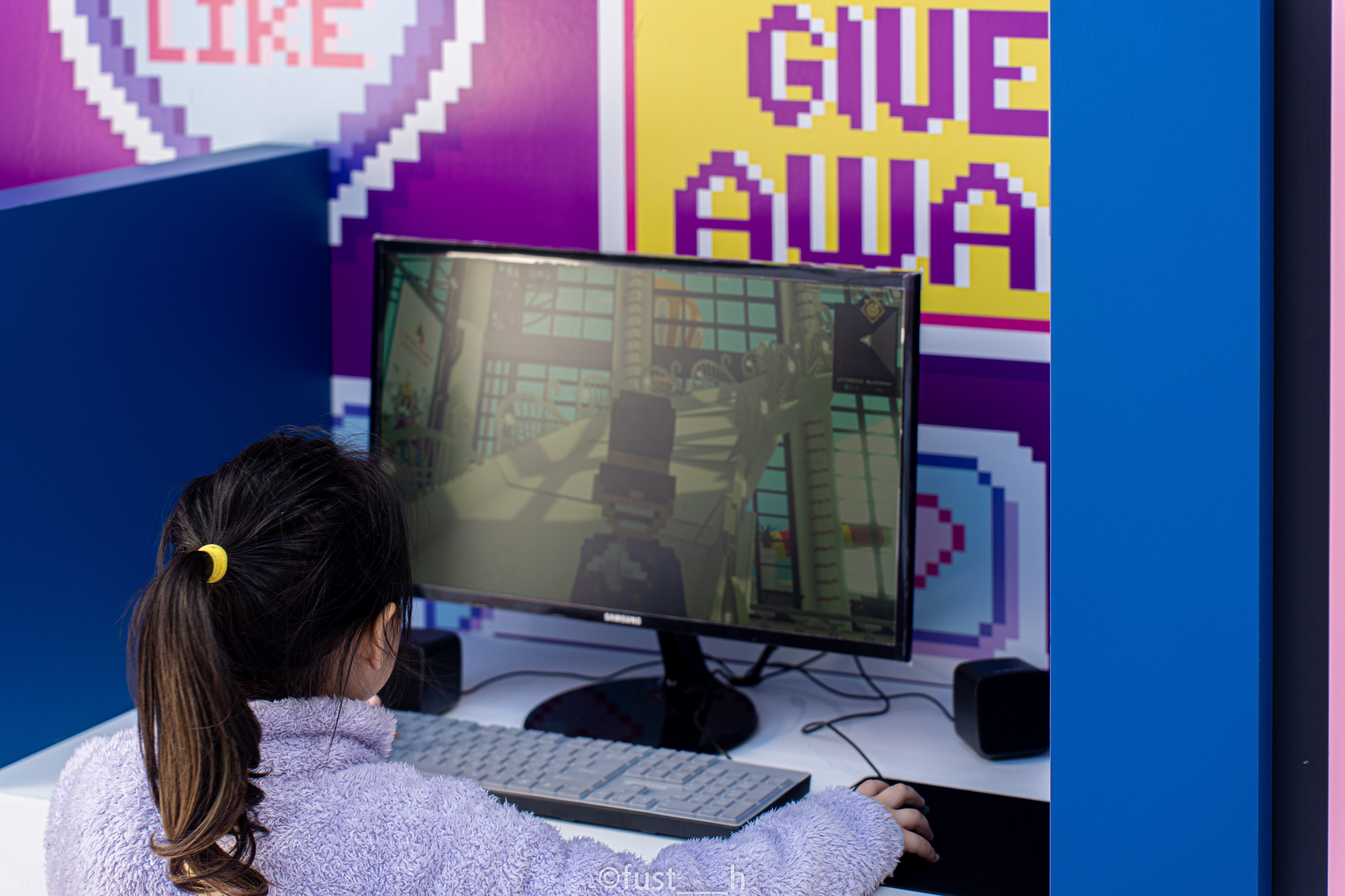 가입 후 좌측에 마련된 2대의 데스크탑에서는 현재 더샌드박스에서도 만나볼 수 있는 롯데월드 메타버스 공간을 체험해볼 수 있어요. 제페토나 마인크래프트, 로블록스처럼 메타버스 게임 공간에 익숙한 어린 친구들도 재미있게 즐기다 간다 그러더군요.