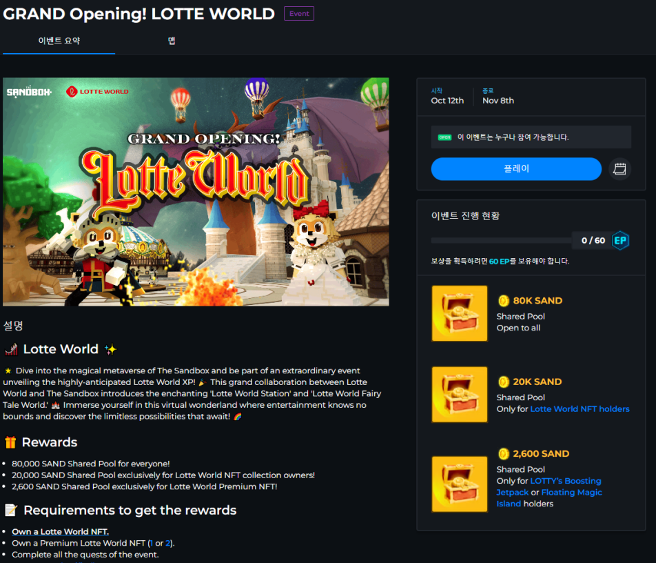 더샌드박스를 통해 체험할 수 있는 롯데월드 메타버스는 11월 8일까지 클라이언트 접속을 통해 집에서도 자유롭게 즐길 수 있어요. 참여 시 샌드박스를 획득할 수 있는 기회도 주어지니, P2E를 만끽해보시기 바래요.