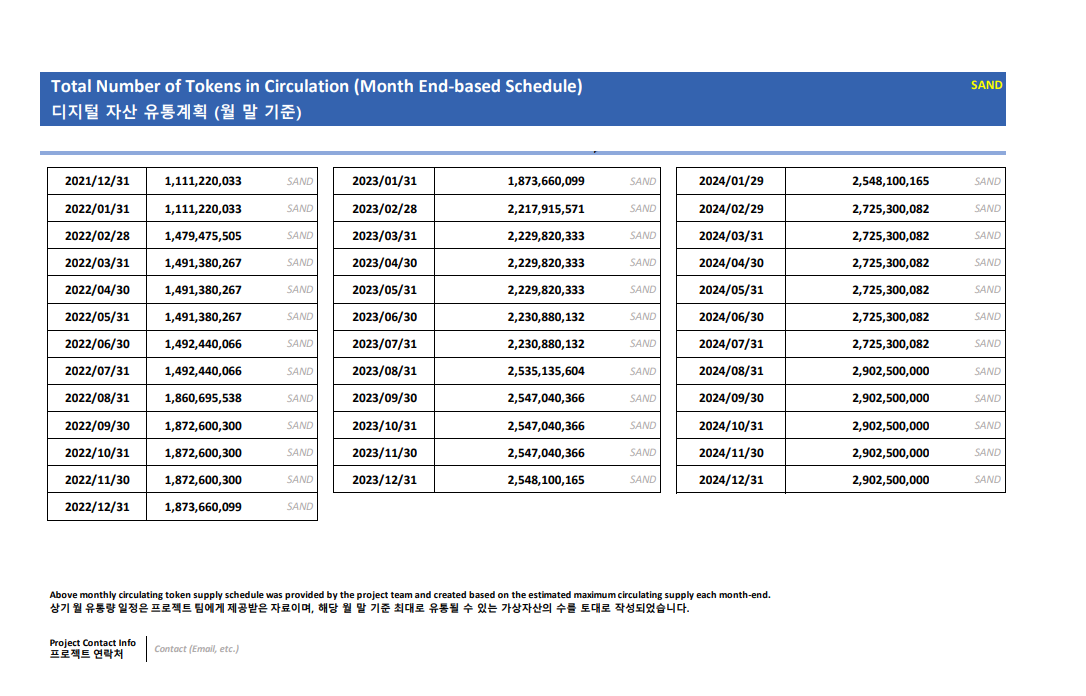 샌드박스 코인은 총 30억개의 물량이 준비되었으며, 2020년 출범 이후 매월 평가 이후 24년 12월 31일까지 최종 30억개 가까이 락업된 물량이 해제됩니다.