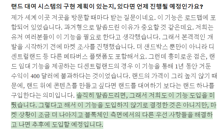 문제는 오랜 시간 동안 마케팅 문구로 활용된 랜드 렌딩 즉, 대여 시스템에 대한 부분에 있어서 샌드박스 개발진들의 입장도 회의적이라는 점이 아닐까 싶은데, 아무래도 디센트럴랜드의 전례가 있어 당분간 대여 기능이 도입되기는 어려울 것 같습니다. 23년 11월 현재를 기준으로 랜드를 대여하는 것 보다 랜드를 구매하는 것이 더 저렴하기 때문에 그런 것 같네요.