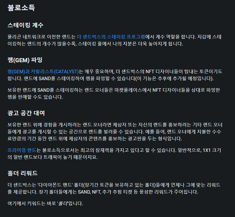 랜드를 통해 기대할 수 있는 수익 창출 수단은 위와 같습니다. 우선 샌드박스 랜드/코인 스테이킹은 여전히 공식 홈페이지에서 진행되고 있습니다. 향후 업데이트로 추가될 젬 파밍이 관건이 될 것 같습니다.