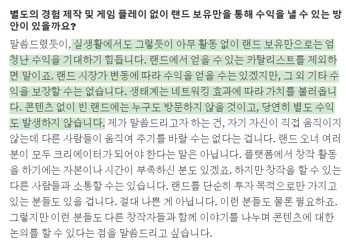 지난 14일 한국에 내한해 오너들을 대상으로 한 AMA에서 공개된 내용입니다. 앞으로 랜드가 오너, 창작자, 사용자 모두에게 열렸고, 다양한 경험을 선사하는데 사용되는 포탈, 도구로서의 역할을 수행하게 되는데요.