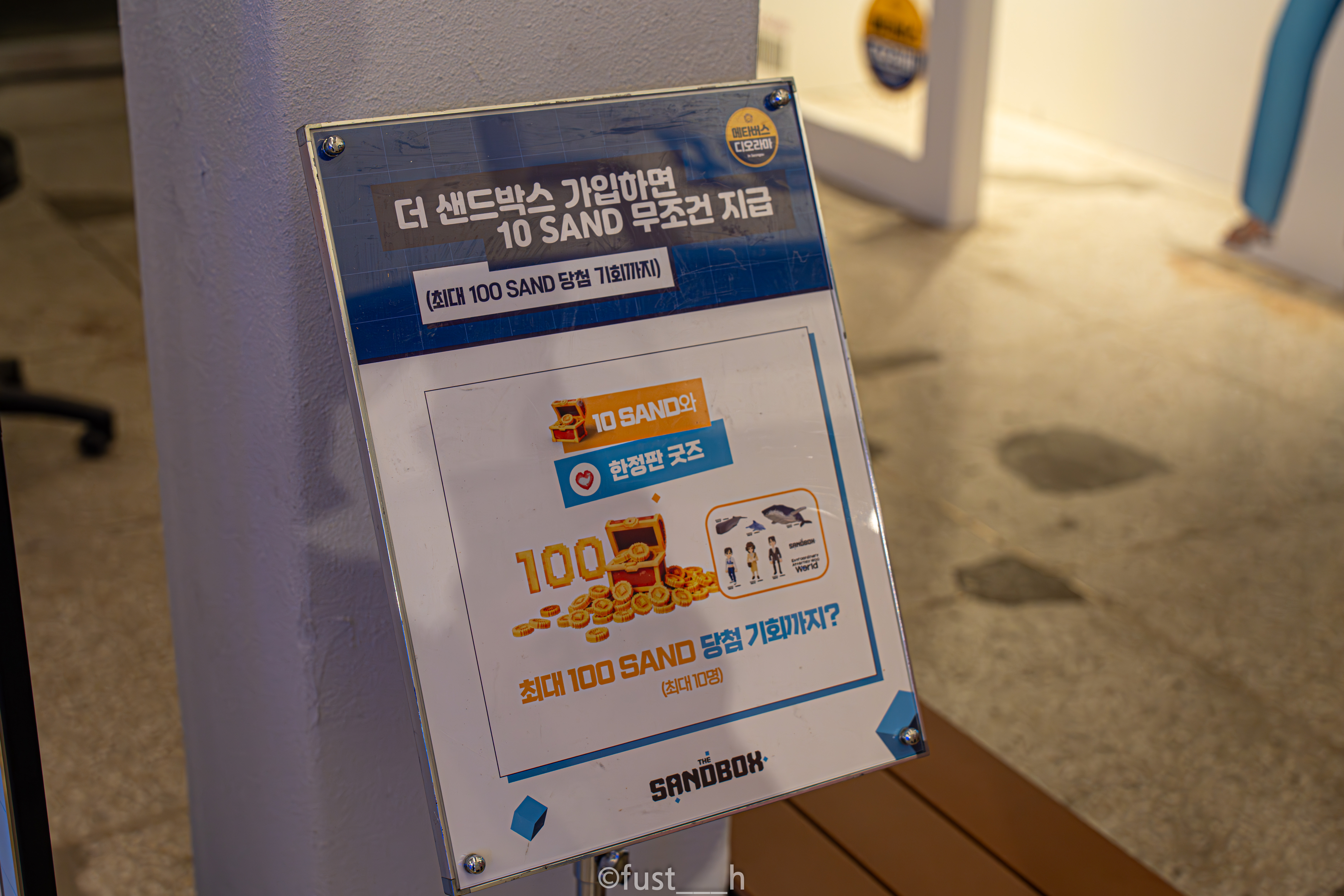 이번 메타버스 디오라마 팝업스토어에서는 더샌드박스 이벤트도 함께 만나볼 수 있습니다. 메타버스 게임 대장 샌드박스 플랫폼에 가입하면, 10SAND가 확정적으로 지급되고, 한정판 굿즈 그리고 최대 100SAND 추첨도 진행되니까 현장 체험존을 둘러보시고, 가입도 해보셨으면 합니다.