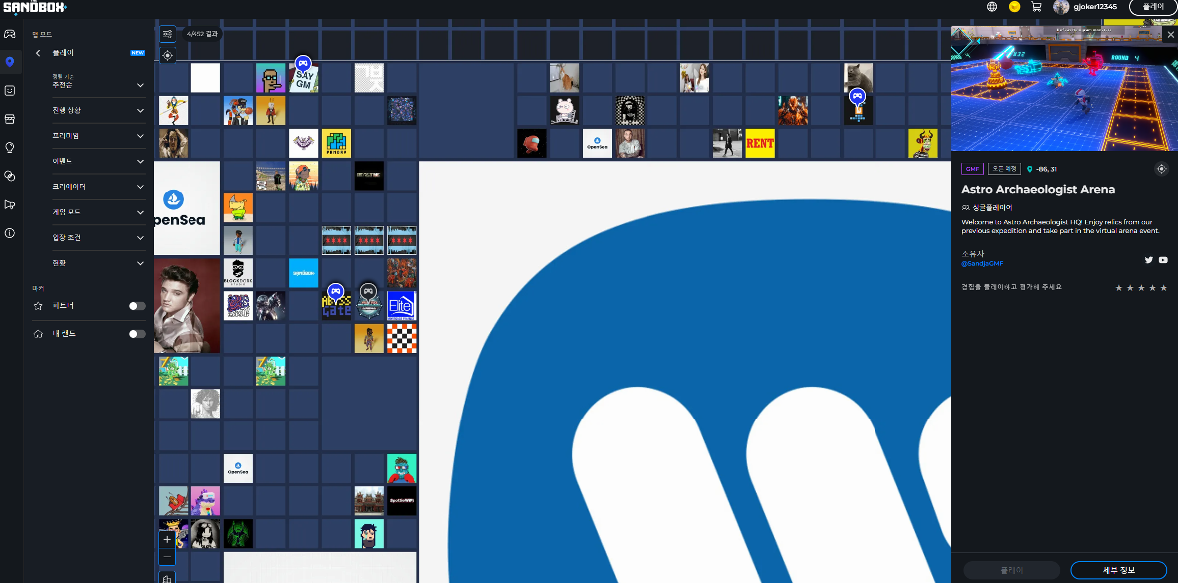 프로필로 설정한 트위터와 유튜브를 통해 게임 플레이를 노출시키고 있고, 샌드박스 계정을 보유한 플레이어 누구나 이 개발자의 랜드에 방문하여 게임 플레이를 경험할 수 있습니다.