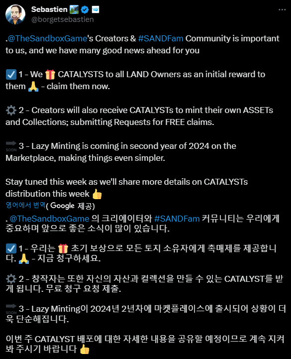메타버스에 누구보다도 진심인 세바스티앙 보르제씨가 카탈리스트 트윗 및 요약 로드맵을 남겼습니다. NFT에 속성을 부여하는 카탈리스트 토큰(ERC-1155)이 출시되었고, 랜드 소유자들에게 지난 12월 14일 에어드랍이 된 바 있습니다.