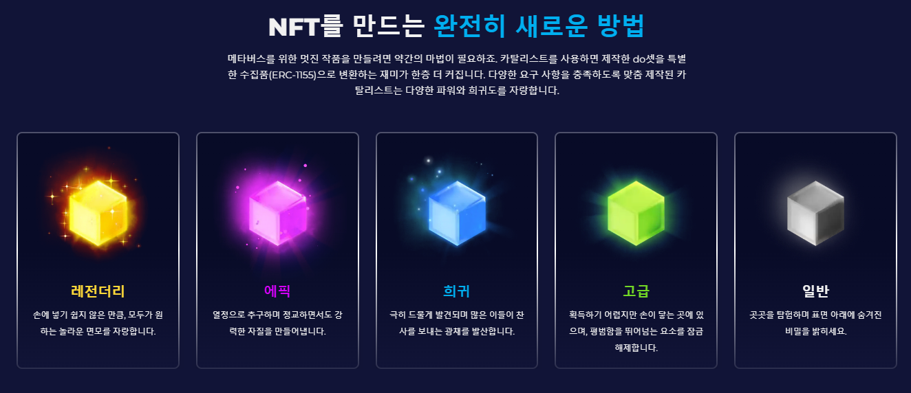 카탈리스트는 NFT 자산의 희귀성을 결정짓는 요소로 5가지 등급으로 나뉩니다. 카탈리스트는 각 등급 별 NFT 파워, 방어력, 스피드 수치를 결정하는 포인트가 존재하며, 부여할 수 있는 포인트 개수 또한 차이가 납니다.