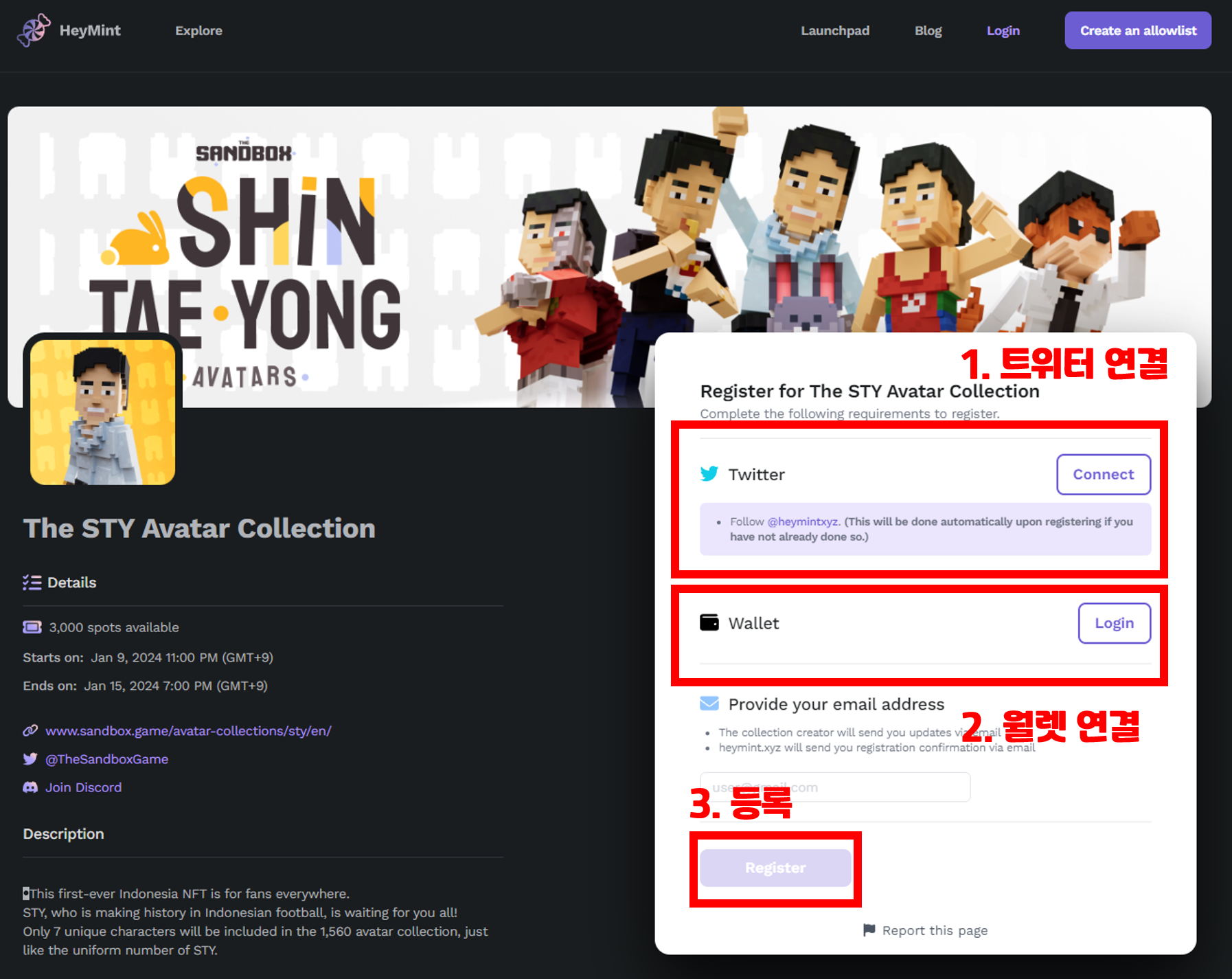 얼로우리스트는 헤이민트에서 진행되며, 트위터, 월렛주소, 등록 순으로 진행됩니다. 등록이 완료되면 얼로으리스트 등록 페이지에서 확인하실 수 있고, 1월 16일 오후11시~1월 17일 오후 10시 59분까지 90SAND 구매 자격이 주어집니다. 해당 일정에 맞춰서 민팅을 진행하시면 되고요.