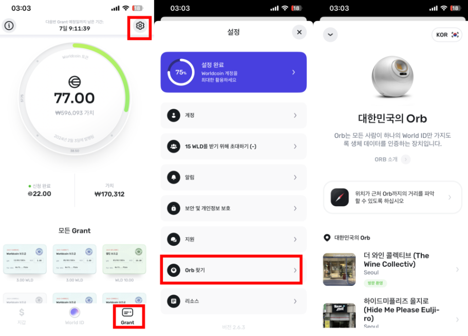 우측 상단의 톱니바퀴-Orb 찾기로 들어가 현재 내 위치에서 가장 가까운 Orb를 찾아줍니다.