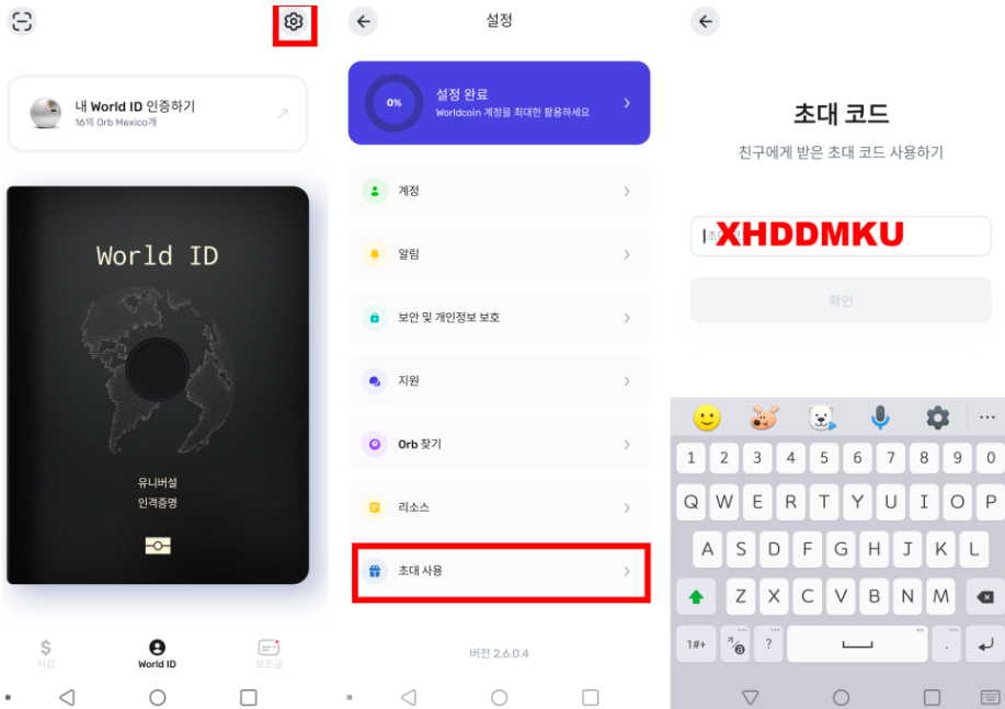 다운로드 받으신 후 톱니바퀴-초대코드를 입력할 수 있는 란에