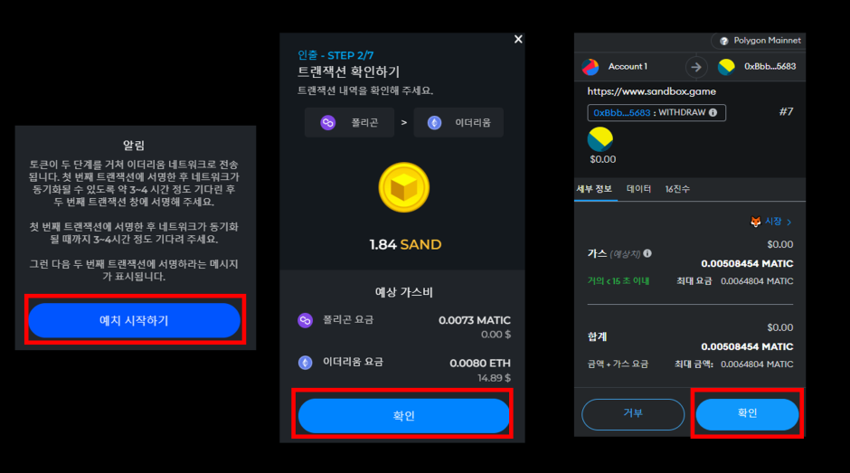 순서대로 예치-확인 그리고 최종적으로 메타마스크 서명을 통해 트랜스퍼를 승인해줍니다. 네트워크 상황에 따라서 소요 시간은 달라질 수 있으니, 기다리시면 됩니다.