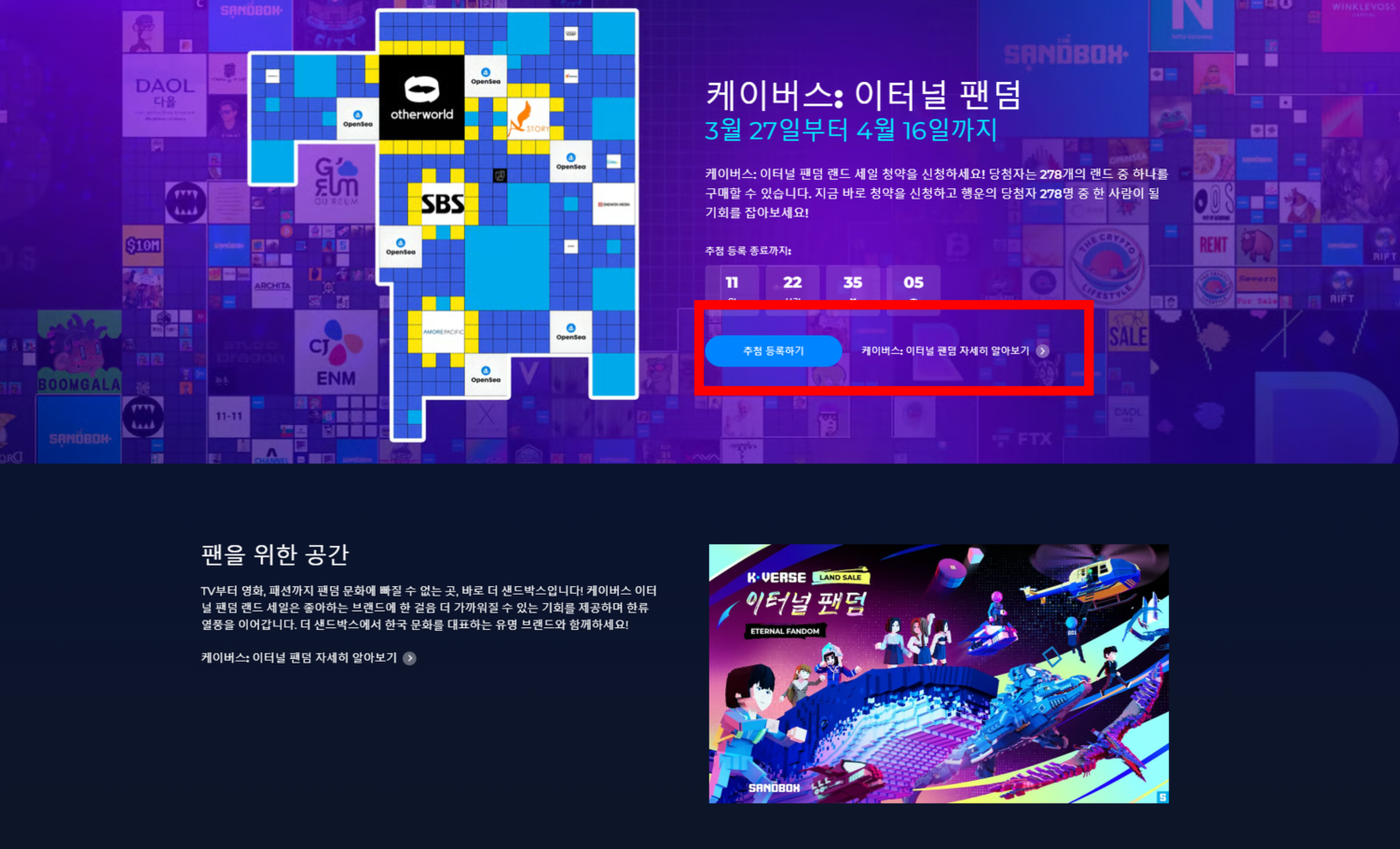| 샌드박스 케이버스 랜드세일 이터널 팬덤 참여 방법 살펴보기 (0) | 2024.04.01 |
