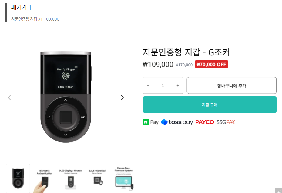 지문인증형 지갑은 EAL5+ 인증을 받은 보안 칩에 블록체인 개인키를 저장합니다. 탑재된 지문센서를 통해 입력되는 개인 지문도 보안 칩에 안전하게 저장합니다. 블루투스 인터페이스를 통해